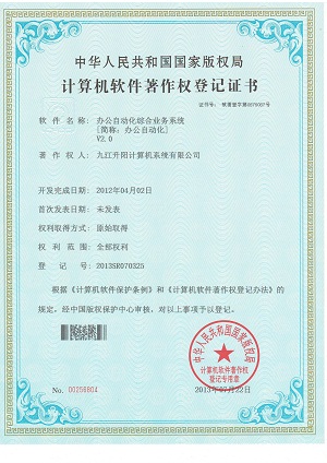 九江升阳计算机系统有限公司的“办公自动化综合业务系统”顺利通过中国版权保护中心审核,获得国家版权局颁发的计算机软件著作权登记证书。